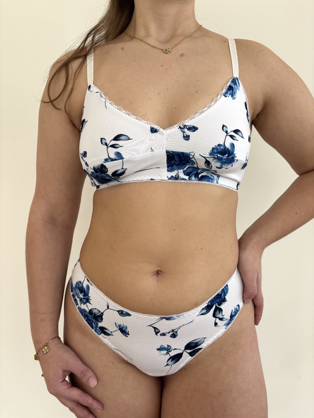 Tento biely bavlnený set nohavičiek a bezkosticovej podprsenky s digitálnou potlačou modrých ruží je dokonalou voľbou pre každodenné pohodlie a eleganciu. Vyrobený je z jemnej, priedušnej bavlny, vďaka čomu pri nosení neškriabe a poskytuje maximálny komfort počas celého dňa. Kombinácia modrých ruží na bielom podklade s béžovou čipkou z nich zároveň robí romantický kúsok spodnej bielizne.